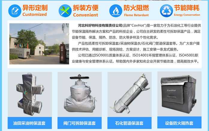 據(jù)了解,科好特公司的品牌"CovHot",是一家致力于為石油化工等行業(yè)提供節(jié)能保溫隔熱解決方案和產(chǎn)品的科技企業(yè),科好特自主研發(fā)銷售的柔性可拆卸保溫產(chǎn)品,滿足設(shè)備節(jié)能、保溫、隔熱、防凍、防火等多樣及個(gè)性化需求。