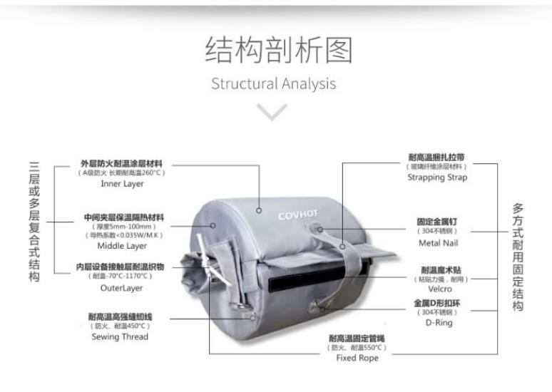 科好特可拆卸保溫套(衣)一般由三層或多層材料構(gòu)成,每一層的材料都有其重要的作用。針對(duì)不同的保溫需求,會(huì)制定不同的材料方案。