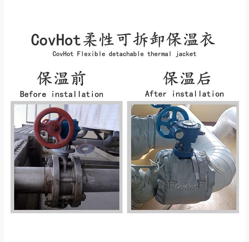 針對以上保溫問題,科好特科技COVHOT經(jīng)過不斷的努力,自主研發(fā)的柔性可拆卸式保溫套產(chǎn)品采用多種新型材料復(fù)合制成,在產(chǎn)品投入使用前,我們都會對材料選擇、外形設(shè)計、安裝方式、搭接方式進(jìn)行全方位考究。
