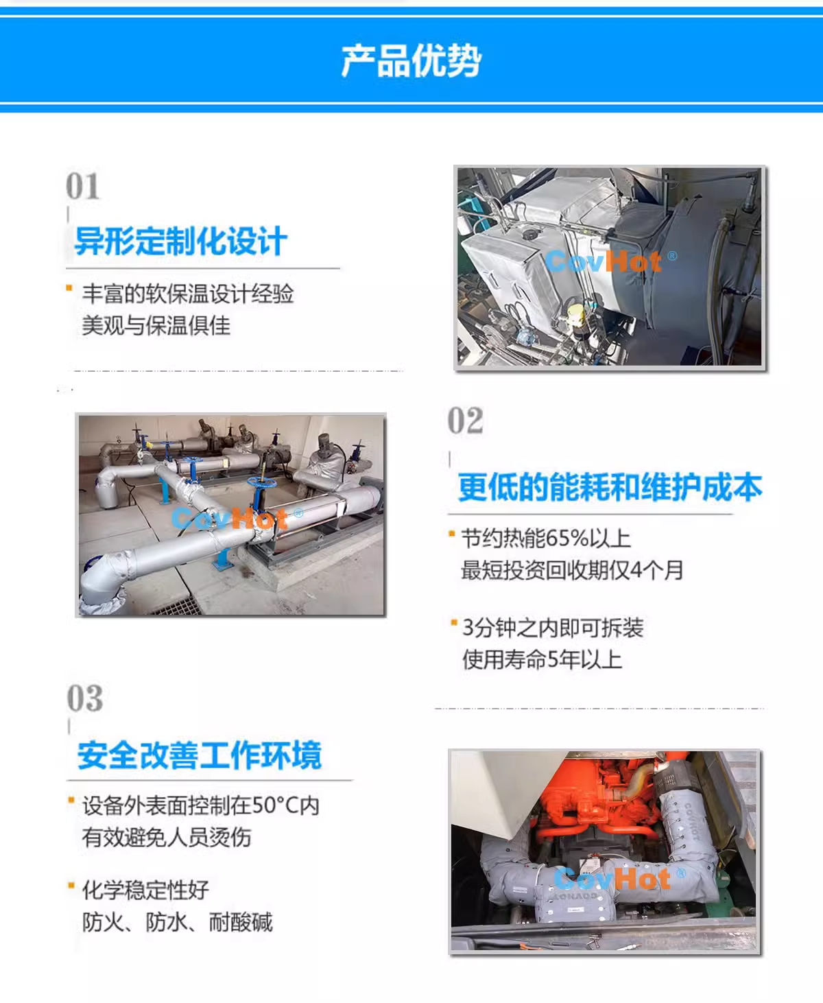 具有易操作,節(jié)省維護(hù)時(shí)間和保溫成本。解決了如法蘭等經(jīng)常拆卸部位難以重新保溫的問(wèn)題,減少了能源浪費(fèi)。
