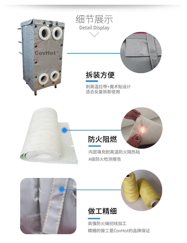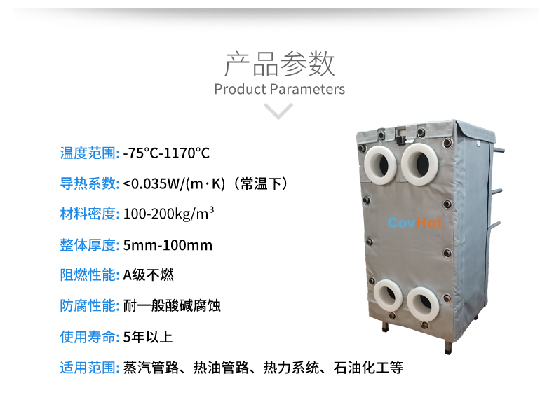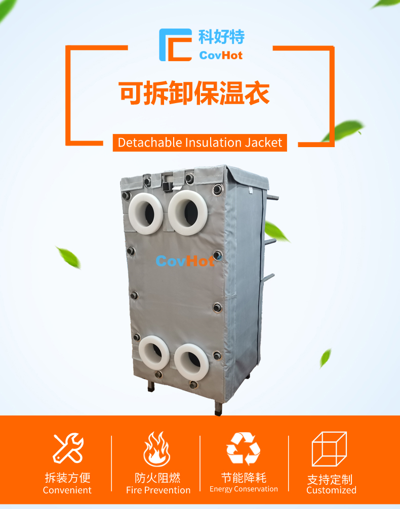 針對(duì)以上的問(wèn)題,河北科好特科技有限責(zé)任公司自主研發(fā)的節(jié)能型板換保溫衣,可以有效減少換熱器的熱量損耗,而且在施工過(guò)程中安裝拆卸方便,節(jié)省人工,可拆卸保溫衣還可重復(fù)使用,起到節(jié)能降耗的效果??坪锰?a href=http://kcyso.cn/e/tags/?tagname=%E5%8F%AF%E6%8B%86%E5%8D%B8%E4%BF%9D%E6%B8%A9%E8%A1%A3 target=_blank class=infotextkey>可拆卸保溫衣根據(jù)設(shè)備不同的尺寸形狀量身定制,可廣泛用于換熱器、閥門(mén)、管道及其它需要保溫或防凍的領(lǐng)域。