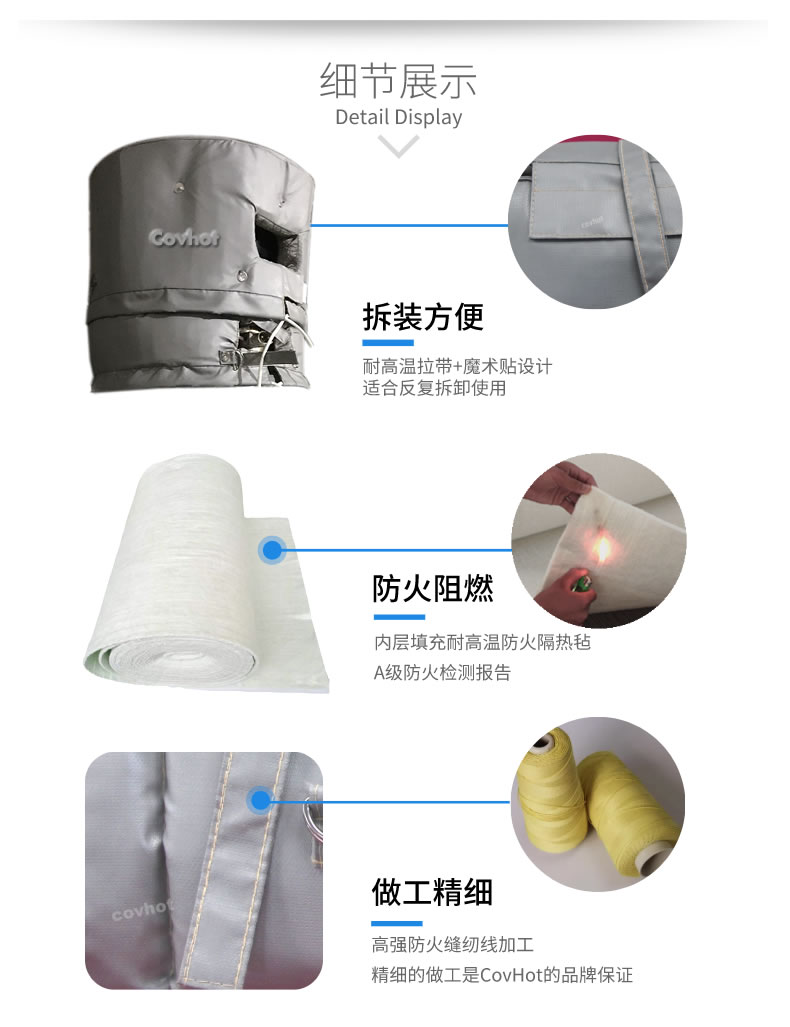 科好特covhot柔性可拆卸可拆卸擠出機(jī)保溫套按照用戶需要設(shè)計制作而成。安裝可拆卸保溫套后,可以讓設(shè)備表面溫度可降到40℃左右,觸摸不燙手。具有隔熱﹑防火防水、防油污、不腐化、耐腐蝕、表面可擦洗、強(qiáng)度大、易彎曲,深受廣大擠出機(jī)設(shè)備用戶喜愛。