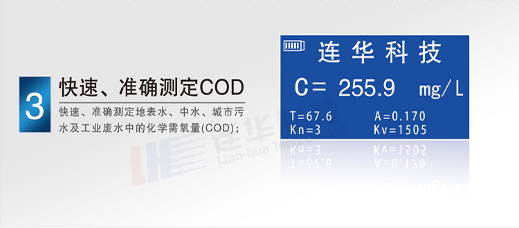 (01) 能準確測定地表水、中水、城市污水、工業廢水中化學需氧量(COD),濃度直讀;